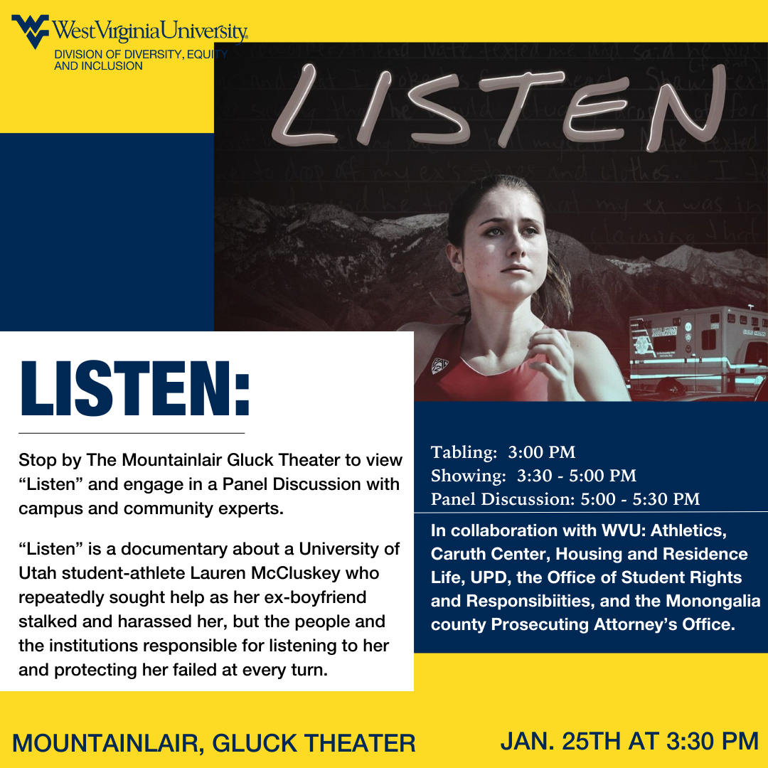 The University community is invited to attend a viewing of the ESPN investigative documentary on Lauren McCluskey titled “Listen” along with a panel discussion with campus and community experts at 3 p.m. Thursday (Jan. 25) in the Mountainlair Gluck Theater.
